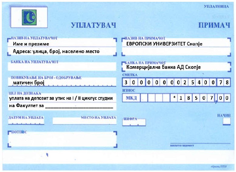 Ве потсетуваме и за можноста за плаќање годишна школарина на 12 и повеќе рати преку кредитите за студирање на Комерцијална банка АД Скопје, достапни по најповолни услови за студентите на Европски Универзитет. Повеќе информации во Студентска служба на тел.бр. 02/320 2100, e-mail: [email protected], како и во експозитурата на КБ лоцирана во управната зграда на Макпетрол-Скопје, тел.бр. 072/266 137.
