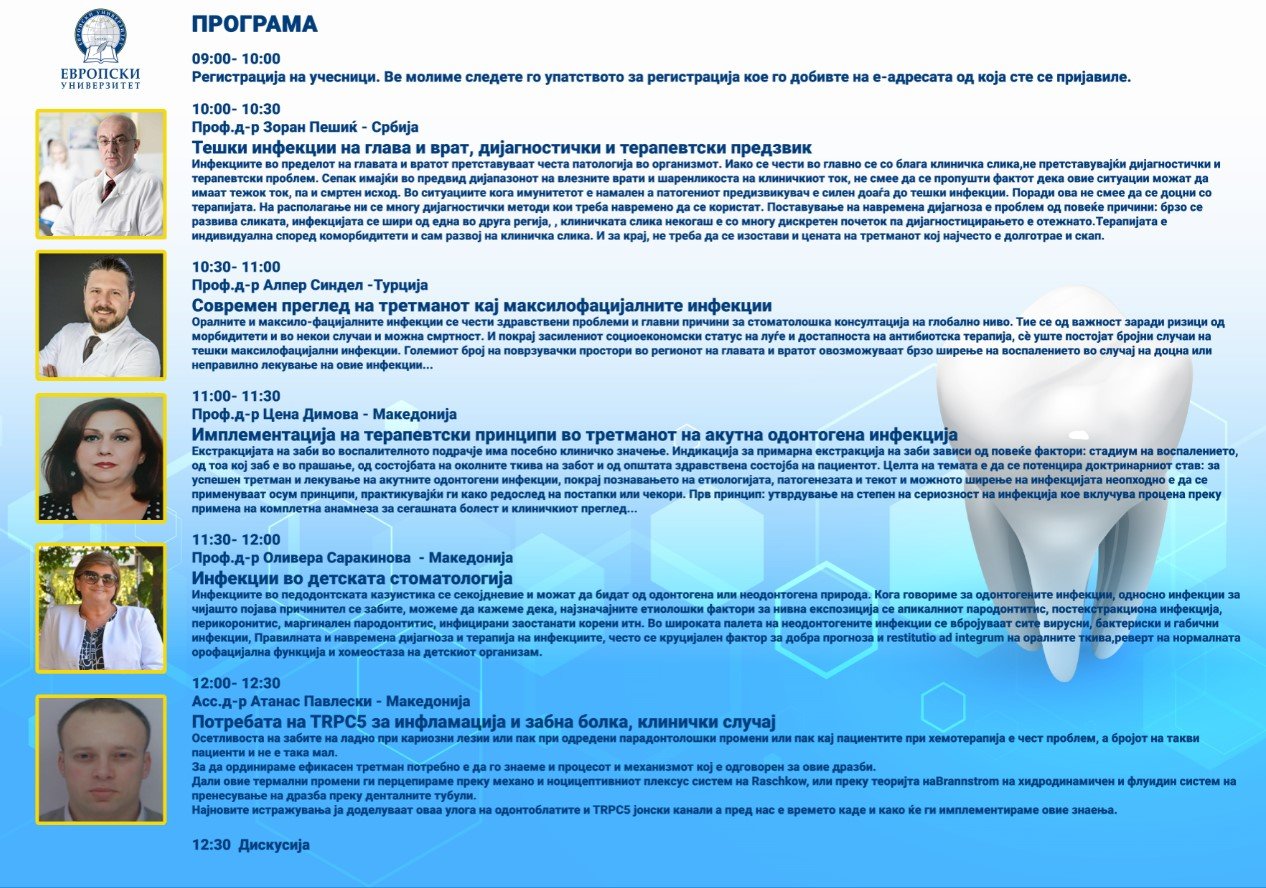 Одонтогените инфекции претставуваат едни од најчестите патологии со кои се сретнуваат стоматолозите во секојдневната пракса. Со оглед на можните сериозни, па и животозагрозувачки компликации кои може да се случат, нивниот ран третман е предизвик, загатка, но и должност на секој стоматолог. Ова специфично време на вонредни услови, рестрикции, неможност за навремена стоматолошка грижа, стресогени фактори, како и други состојби кои влијаат на имунитетот и општото здравје на пациентите, придонесоа за зголемена фрекфенција како на одонтогени, така и на неодонтогени инфекции. Од друга страна пак, прекумерната злоупотреба на антибиотици, неправилниот и ненавремен третман на овие инфекции, непочитувањето на дијагностичкиот протокол и поставувањето на погрешни дијагнози, дополнително го комплицираат текот и исходот од овие состојби. Преку нашите поканети предавачи, ќе се обидеме да поставиме насоки и да се потсетиме на современите протоколи за дијагноза и третман на инфекциите со потекло од усната празнина.
