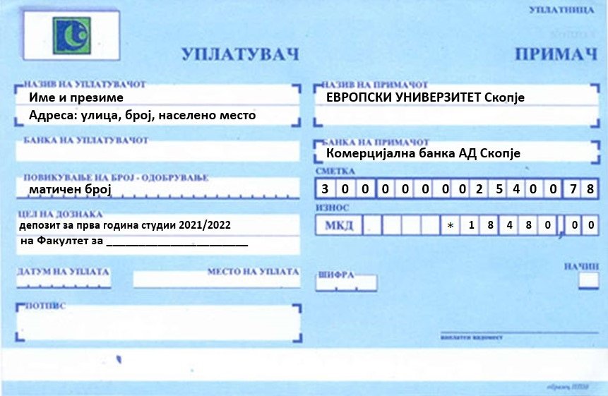 УПЛАТНИЦА ЗА ДЕПОЗИТ – Факултет за детективи и криминалистика, Факултет за арт и дизајн, Факултет за економски науки, Факултет за информатика, стручни студии Забни техничари на Факултетот за стоматологија