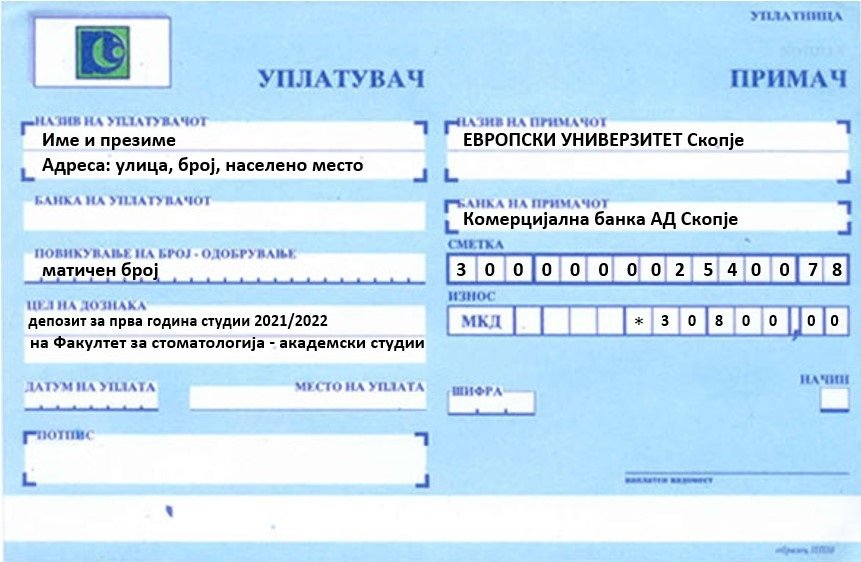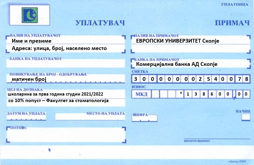 УПЛАТНИЦА ЗА ШКОЛАРИНА СО 10% ПОПУСТ – Факултет за стоматологија (академски студии)