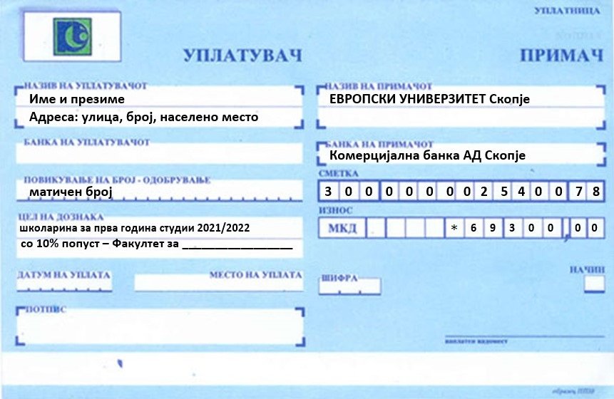УПЛАТНИЦА ЗА ШКОЛАРИНА СО 10% ПОПУСТ – Факултет за детективи и криминалистика, Факултет за арт и дизајн, Факултет за економски науки, Факултет за информатика, стручни студии Забни техничари на Факултетот за стоматологија