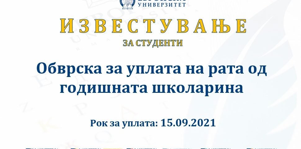 ве потсетуваме за обврската за уплата на рата од годишната школарина до 15-ти септември, согласно договорот за студирање.