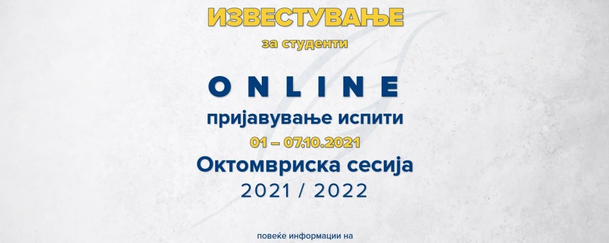 Пријавувањето на испитите од октомвриска испитна сесија во академската 2021/22 година ќе се врши on-line во периодот од 01.10 до 07.10.2021 година.