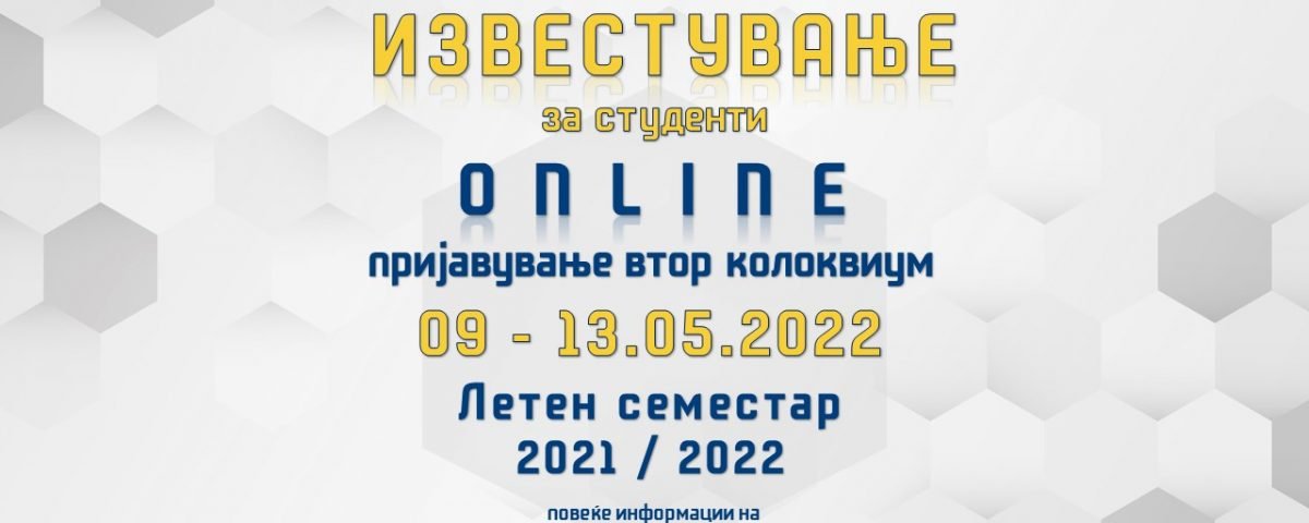 Пријавувањето на прв колоквиум во зимскиот семестар во академската 2021/22 година ќе се врши on-line во периодот од 01.11 до 05.11.2021 година.