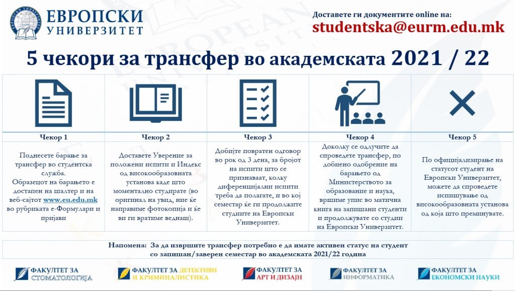 Доколку сте заинтересирани за трансфер од друга високообразовна установа – искористете ја можноста да се запишете до второто затворање на матичната книга (најдоцна до 15.02.2022) со премин на некој од факултетите во состав на Европски Универзитет, следејќи ги претставените 5 чекори: