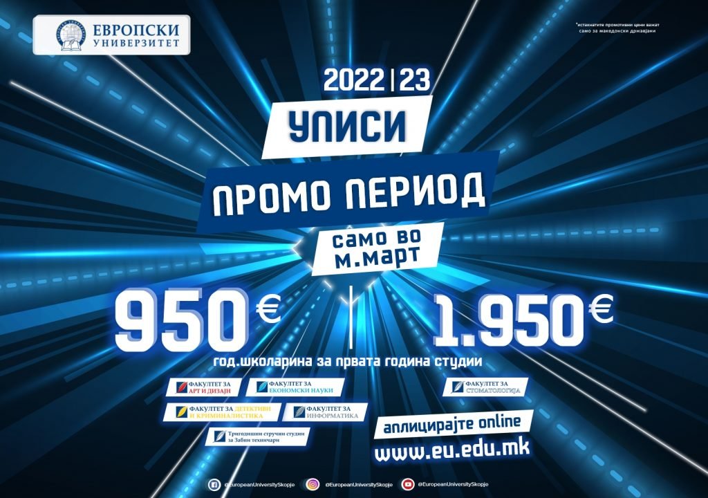 Денес – 01.03.2022 (вторник), официјално започнуваат уписите на I и II циклус студии во академската 2022/2023 година, на факултетите во состав на Европски Универзитет Скопје.