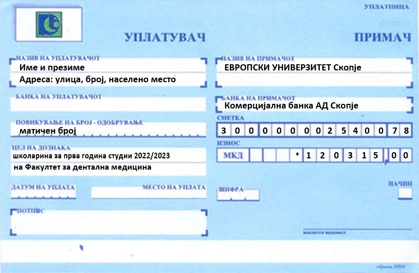 Уплатница за школарина – Факултет за дентална медицина (академски студии)