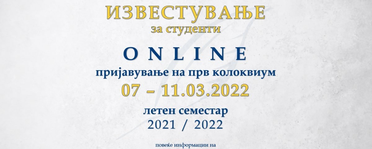 Пријавувањето на првиот колоквиум во летниот семестар од академската 2021/22 година ќе се врши on-line во периодот од 07.03 до 11.03.2022 година.