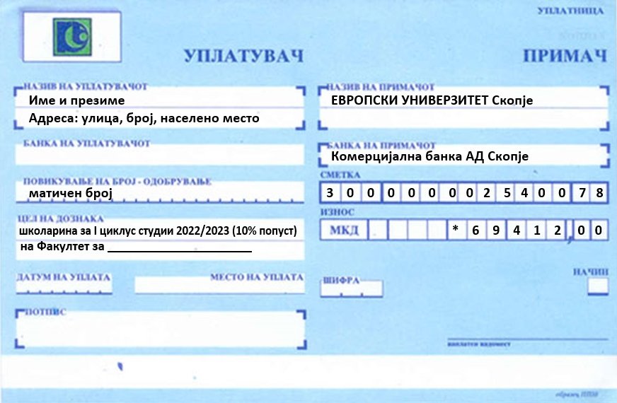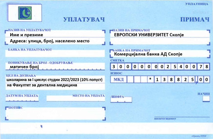 УПЛАТНИЦА ЗА ШКОЛАРИНА (10% ПОПУСТ ЗА I ГОДИНА) – Факултет за дентална медицина (академски студии)