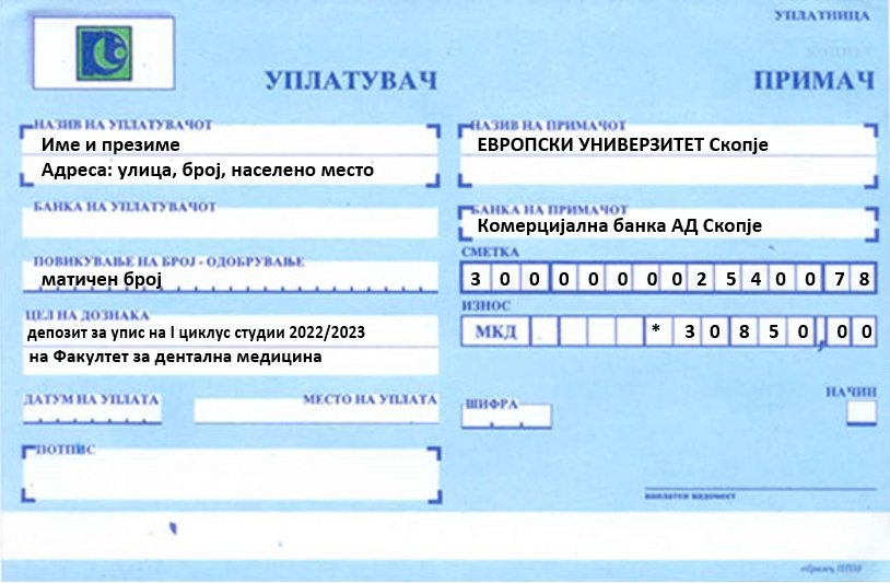 Уплатница за депозит – Факултет за дентална медицина (академски студии)