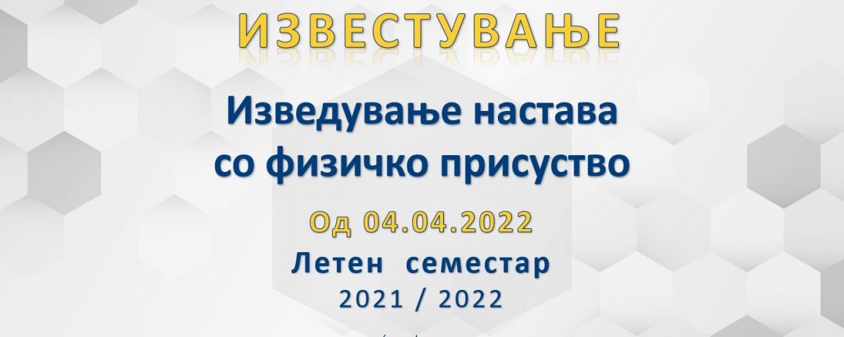 Ве известуваме дека наставата во летниот семестар 2021/2022 година ќе се изведува со физичко присуство на студентите од сите факултети во состав на Европски Универзитет.