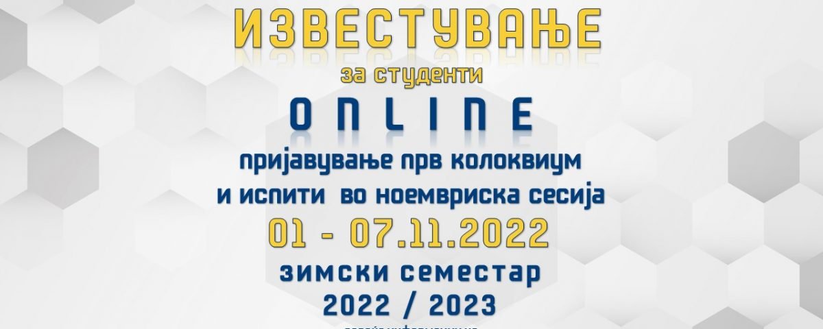 Пријавувањето на испитите од ноемвриската сесија ќе се врши on-line во периодот од 01.11 до 07.11.2022 година.