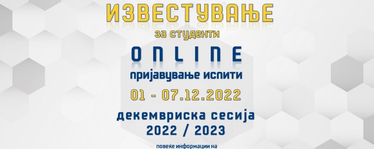 Пријавувањето на испитите од декемврискиот испитен рок ќе се врши on-line во периодот од 01.12 до 07.12.2022 година.