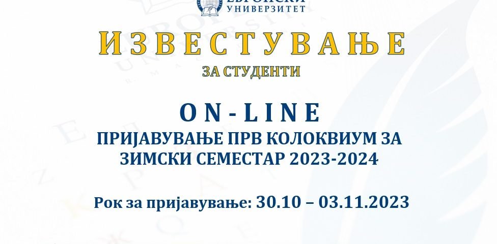 Пријавувањето на првиот колоквиум во зимскиот семестар од академската 2023/24 година ќе се врши on-line во периодот од 30.10 до 03.11.2023 година.