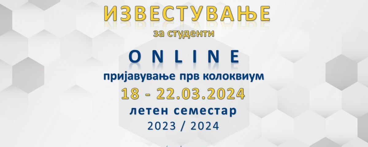 Пријавувањето на првиот колоквиум во летниот семестар од академската 2023/24 година ќе се врши on-line во периодот од 18.03 до 22.03.2024 година.