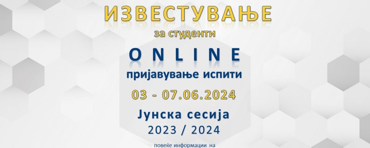 Пријавувањето на испитите од јунскиот испитен рок ќе се врши on-line во периодот од 03.06 до 07.06.2024 година.