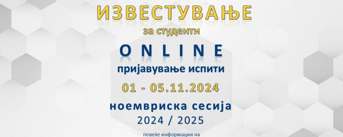 Пријавувањето на испитите од ноемврискиот испитен рок ќе се врши on-line во периодот од 01.11 до 05.11.2024 година.