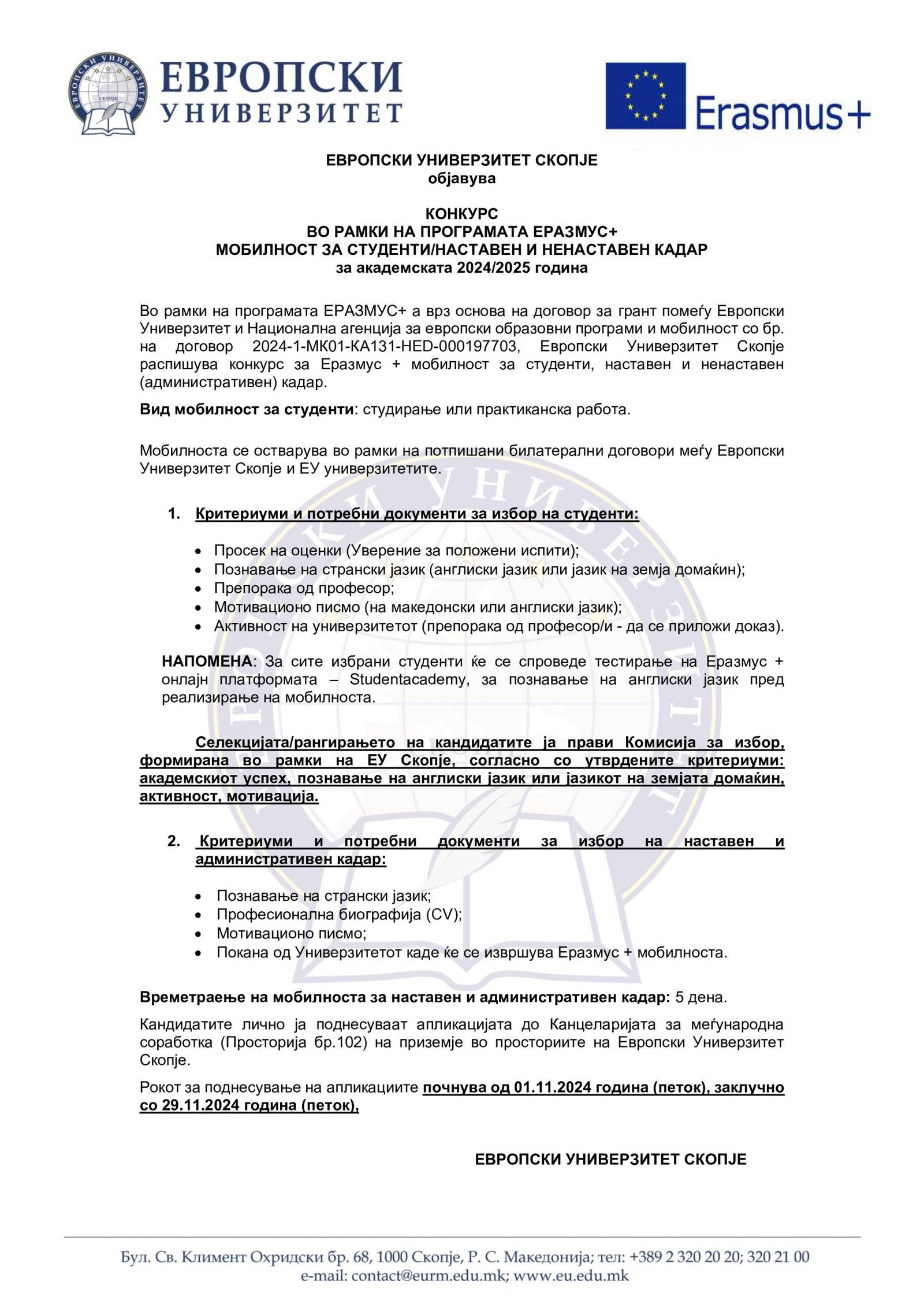 ЕРАЗМУС+ МОБИЛНОСТ ЗА СТУДЕНТИ/НАСТАВЕН И НЕНАСТАВЕН КАДАР за академската 2024/2025 година