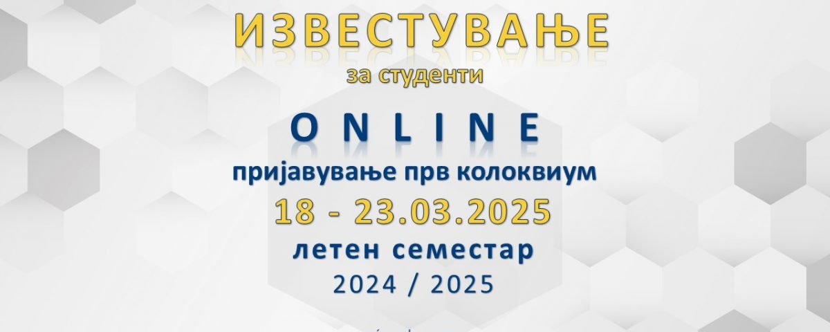 Пријавувањето на првиот колоквиум во летниот семестар од академската 2024/25 година ќе се врши on-line во периодот од 18.03 до 23.03.2025 година.