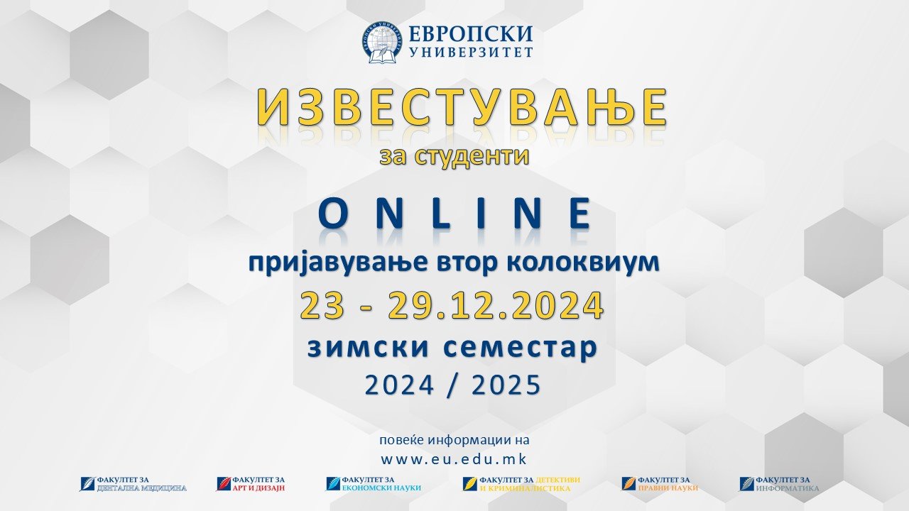 ИЗВЕСТУВАЊЕ ЗА СТУДЕНТИ – ON-LINE ПРИЈАВУВАЊЕ НА ВТОР КОЛОКВИУМ – ЗИМСКИ СЕМЕСТАР 2024/2025