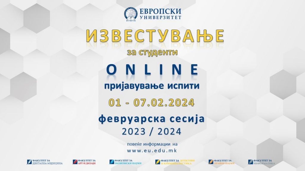 Почитувани студенти, Пријавувањето на испитите од февруарскиот испитен рок ќе се врши on-line во периодот од 01.02 до 07.02.2024 година. Согласно глобалниот календар на активности, полагањето […]