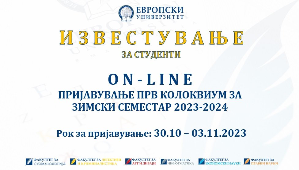 Почитувани студенти Пријавувањето на првиот колоквиум во зимскиот семестар од академската 2023/24 година ќе се врши on-line во периодот од 30.10 до 03.11.2023 година. Согласно глобалниот […]