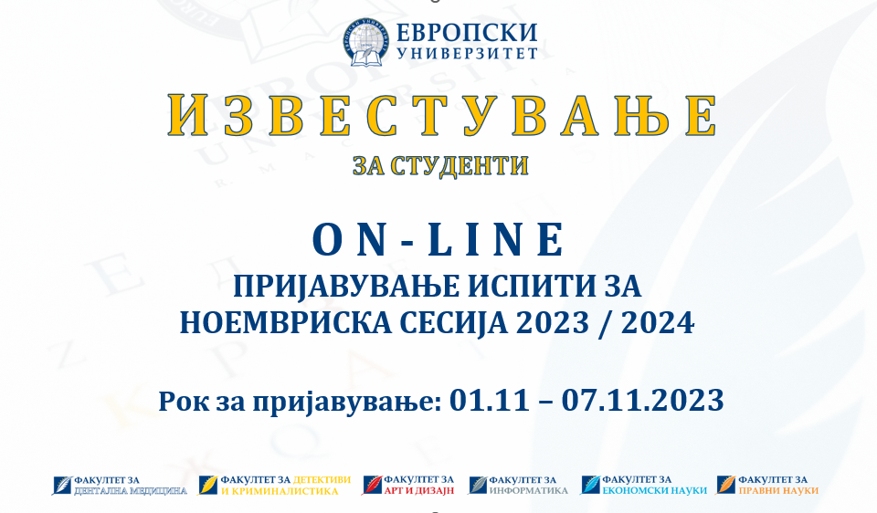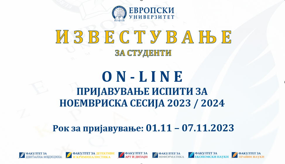 Почитувани студенти, Пријавувањето на испитите од ноемврискиот испитен рок ќе се врши on-line во периодот од 01.11 до 07.11.2023 година. Согласно глобалниот календар на активности, полагањето […]