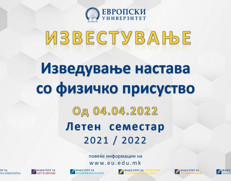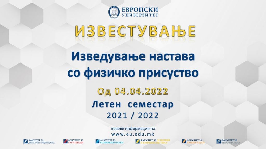 Почитувани студенти, Ве известуваме дека наставата во летниот семестар 2021/2022 година ќе се изведува со физичко присуство на студентите од сите факултети во состав на Европски […]