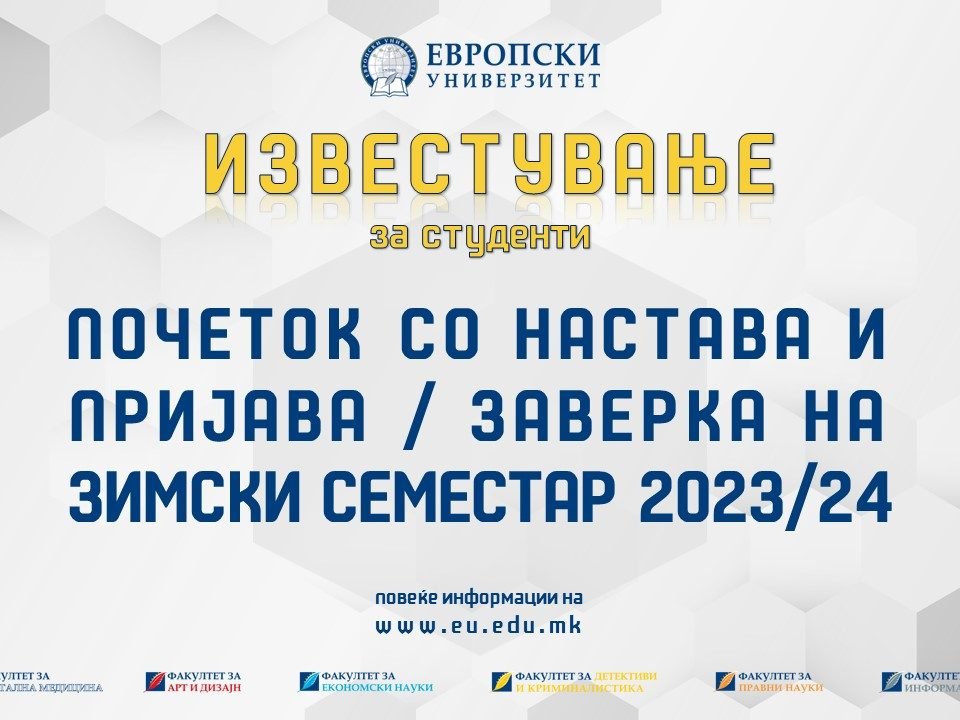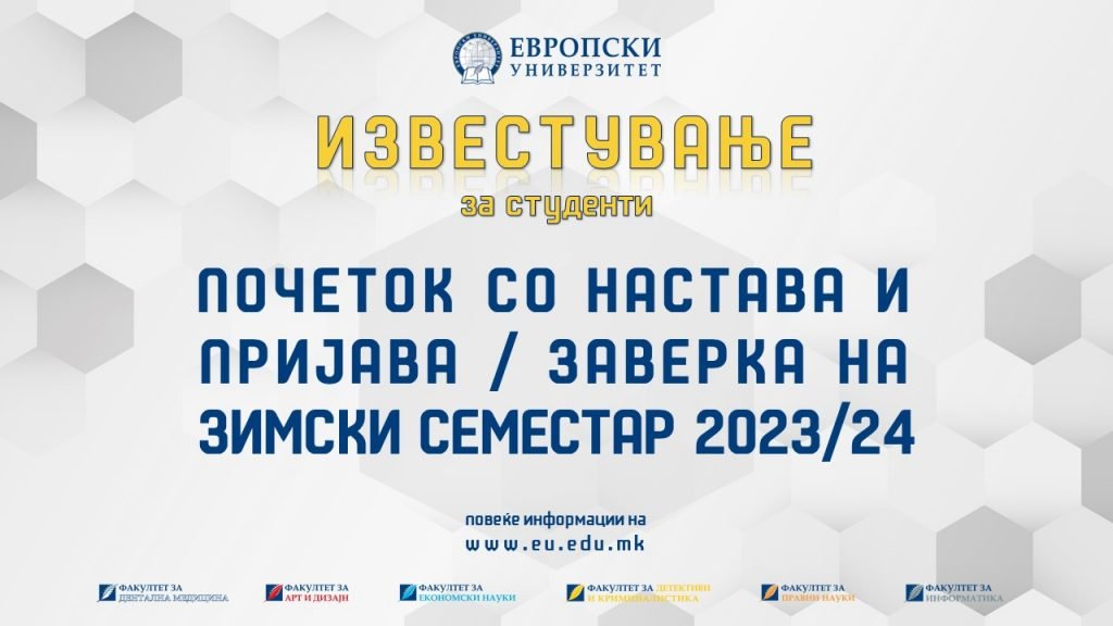 Почитувани студенти, Ве известуваме дека наставата во зимскиот семестар од академската 2023/2024 година започнува на ден 12.10.2023 (четврток), при што продолжуваат редовните наставни активности на сите […]