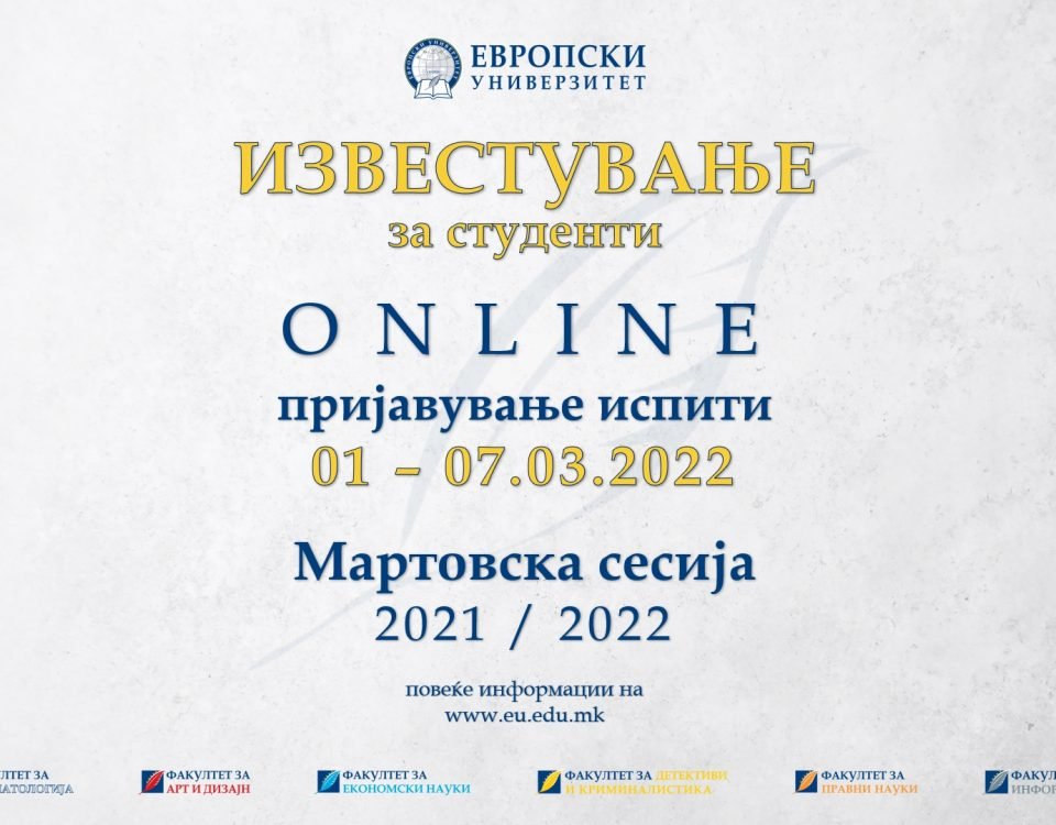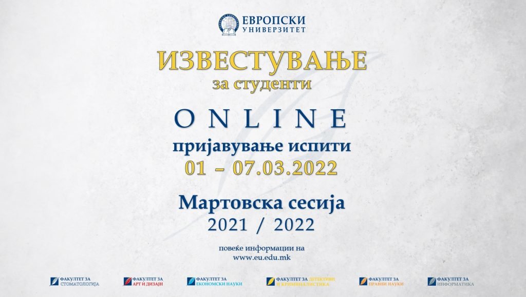 Почитувани студенти, Пријавувањето на испитите од мартовската испитна сесија во академската 2021/22 година ќе се врши on-line во периодот од 01.03 до 07.03.2022 година. Согласно глобалниот календар […]