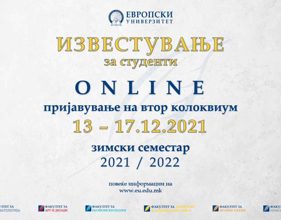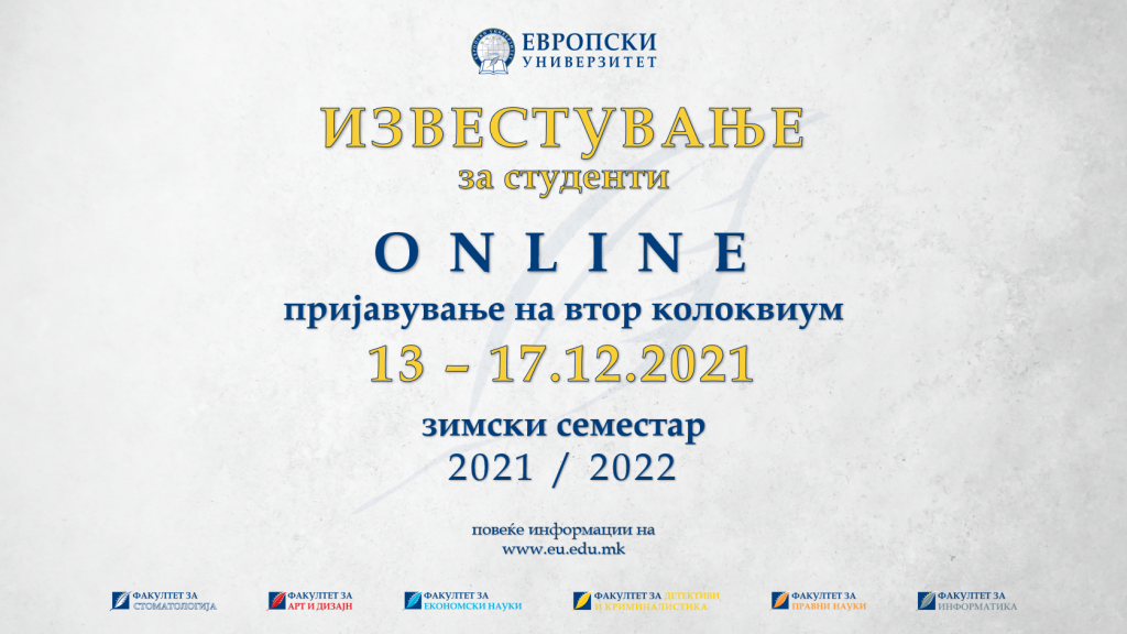 Почитувани студенти, Пријавувањето на вториот колоквиум во зимскиот семестар во академската 2021/22 година ќе се врши on-line во периодот од 13.12.2021 до 17.12.2021 година. Согласно глобалниот календар