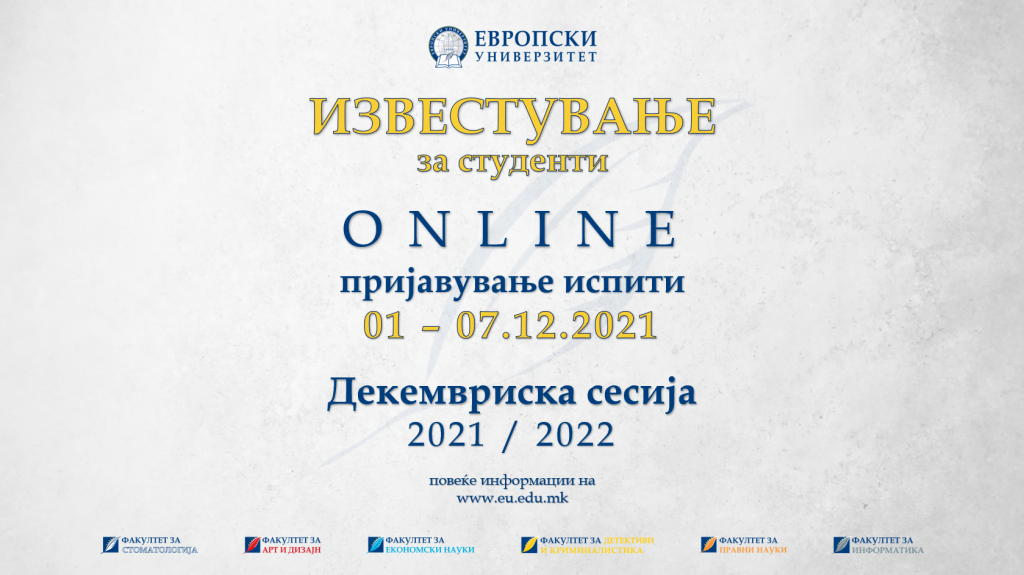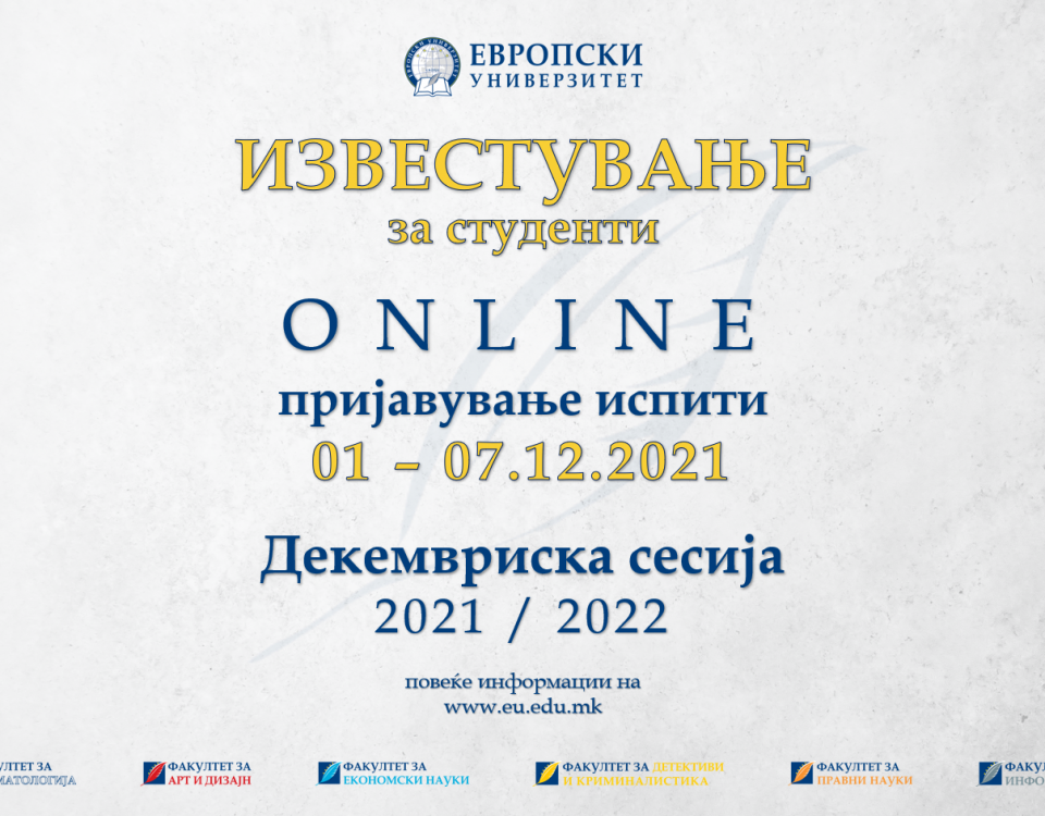 Почитувани студенти, Пријавувањето на испитите од декемвриската испитна сесија во академската 2021/22 година ќе се врши on-line во периодот од 01.12 до 07.12.2021 година. Согласно глобалниот […]