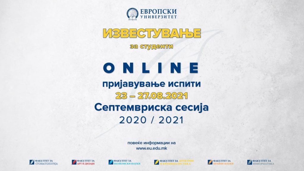 Почитувани студенти, Пријавувањето на испитите од септемвриската испитна сесија во академската 2020/21 година ќе се врши on-line во периодот од 23.08 до 27.08.2021 година. Согласно глобалниот […]