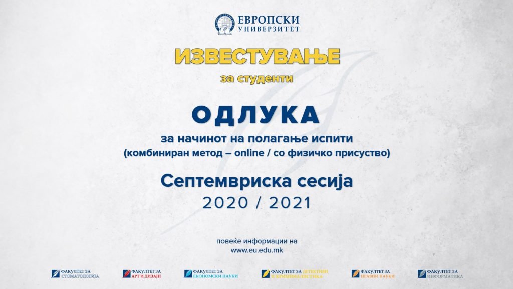Почитувани студенти, Согласно донесената одлука на Ректорската управа на ЕВРОПСКИ УНИВЕРЗИТЕТ Скопје, Ве известуваме дека: СЕ ВОВЕДУВА комбиниран метод – online / физичко присуство, за полагање […]