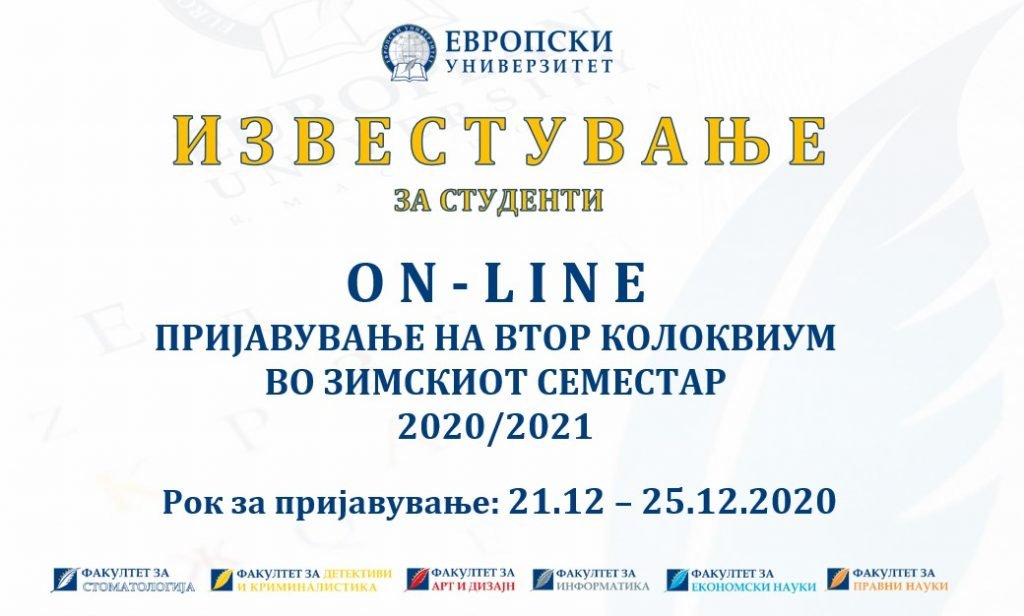Почитувани студенти, Пријавувањето на вториот колоквиум во зимскиот семестар од академската 2020/21 година ќе се врши on-line во периодот од 21.12 до 25.12.2020 година. Согласно глобалниот […]