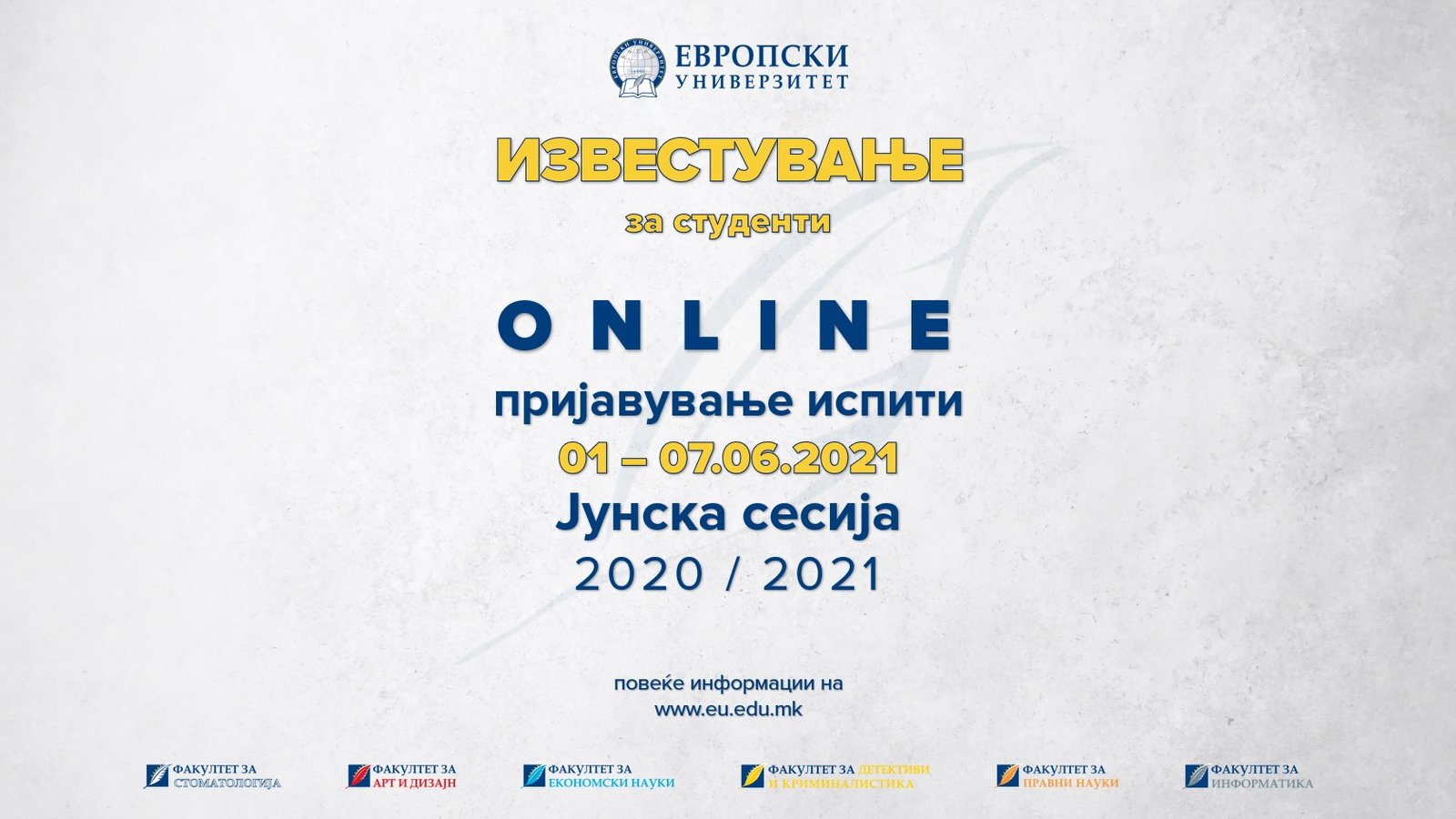 Почитувани студенти, Пријавувањето на испитите од јунската испитна сесија во академската 2020/21 година ќе се врши on-line во периодот од 01.06 до 07.06.2021 година. Согласно глобалниот […]