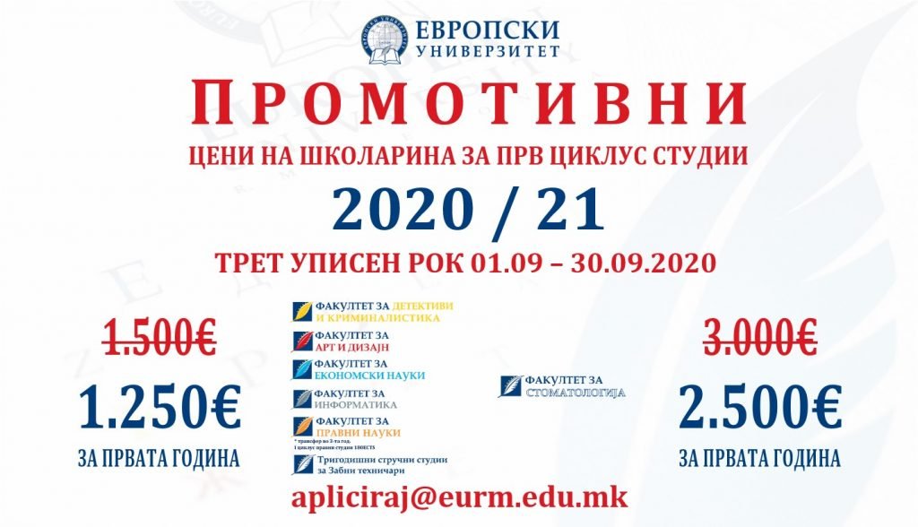 Почитувани идни студенти, Со оглед на моменталната состојба и финансиските последици предизвикани од ширењето на коронавирусот (Covid-19), Европски Универзитет и понатаму овозможува поволности при уписот. Сите […]