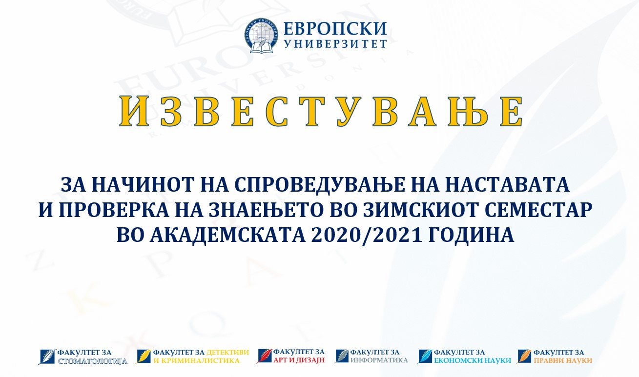 Почитувани студенти, Ве известуваме дека Европски Универзитет воведува комбинирана форма на настава во зимскиот семестар од академската 2020/2021 година: а) on-line, и б) со физичко присуство […]