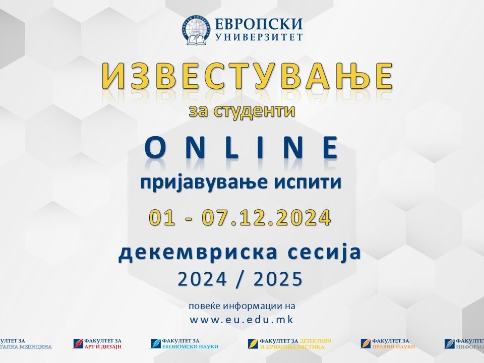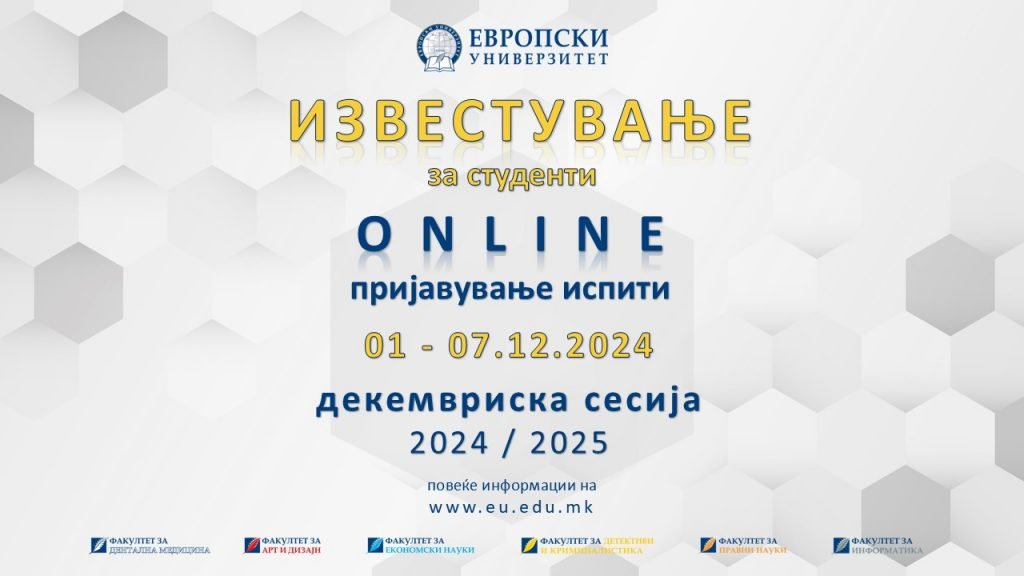 Почитувани студенти, Пријавувањето на испитите од декемврискиот испитен рок ќе се врши on-line во периодот од 01.12 до 07.12.2024 година. Согласно глобалниот календар на активности, полагањето […]