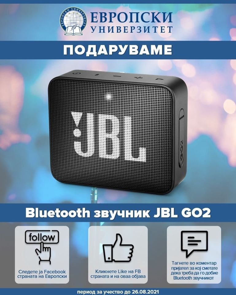 Почитувани, Европски Универзитет подарува Bluetooth звучник JBL GO2 на еден среќен добитник. Учеството е согласно упатствата од оваа објава: 1. Следете ја Facebook страната на Европски […]