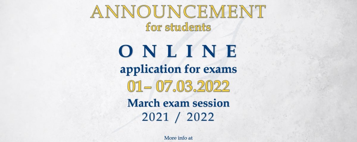 Please be informed that the exam registration for the March exam session 2021/2022 will be done online starting from March 1st to March 7th 2022.