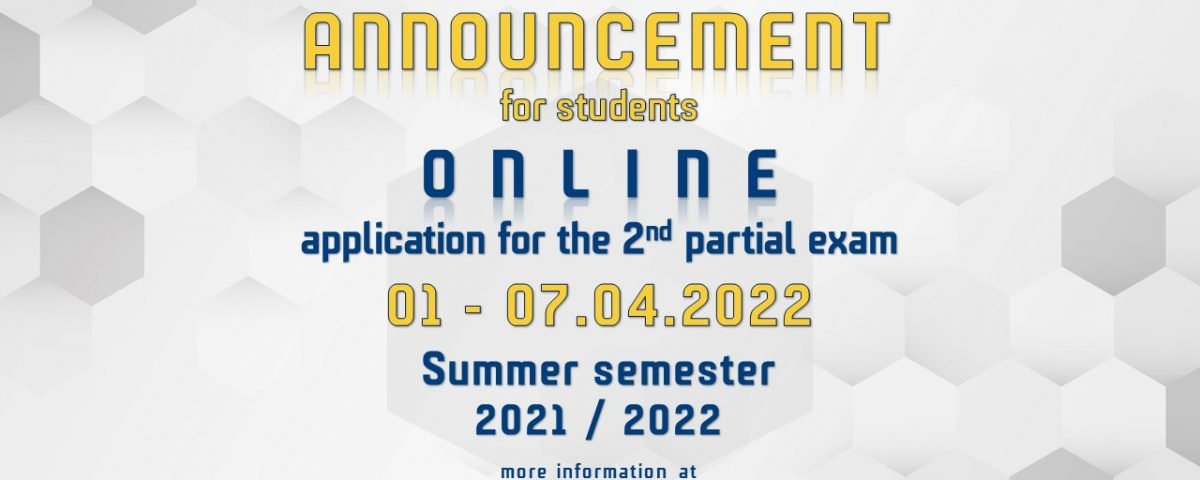 Please be informed that the registration for the upcoming Second Partial Exam Session 2021/2022 (summer semester) will be done online starting from May 09th to May 13th 2021.