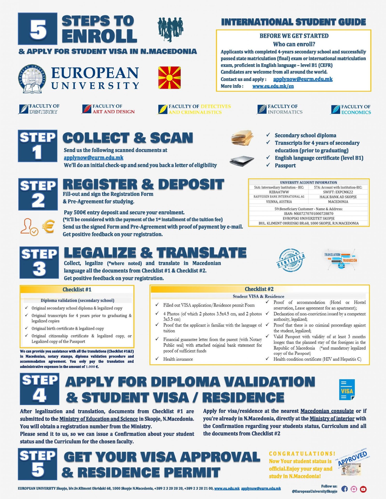 For the document handling services in N.Macedonia regarding the secondary school diploma validation and the student visa/residence procedure (all the translations, notary stamps, state administrative taxes, submitting application to the Ministry, etc.) we offer our assistance for an one-time fee of 1.000€.