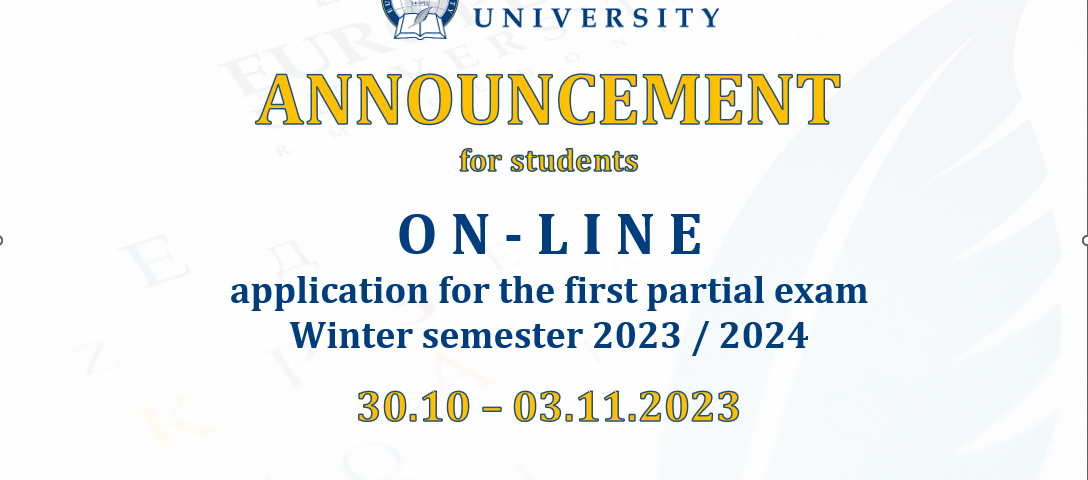 Please be informed that the registration for the upcoming First Partial Exam Session 2023/2024 (winter semester) will be done online starting from October 30th to November 3th 2023.