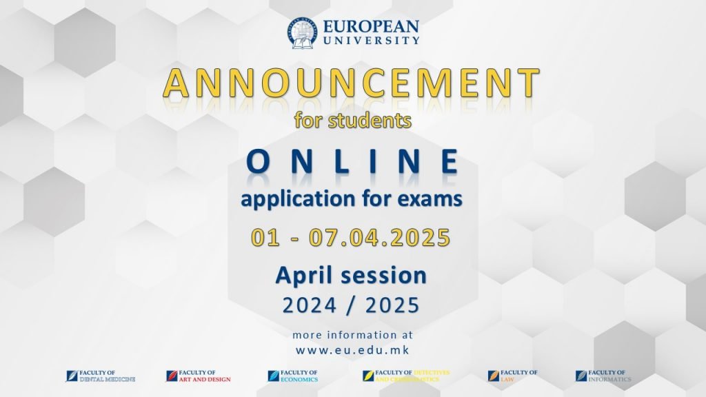 For information on specific schedules (date and time of the exam), please regularly check our notice boards on the official website www.eu.edu.mk and on the social network pages.