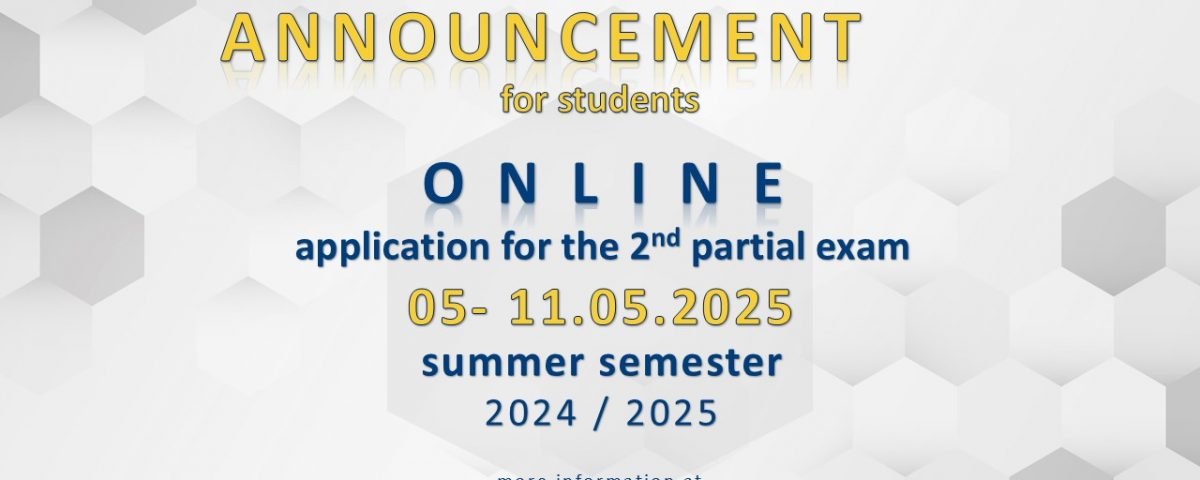 Please be informed that the registration for the upcoming Second Partial Exam Session 2024/2025 (summer semester) will be done online starting from Маy 5th to Мay 11th 2025.