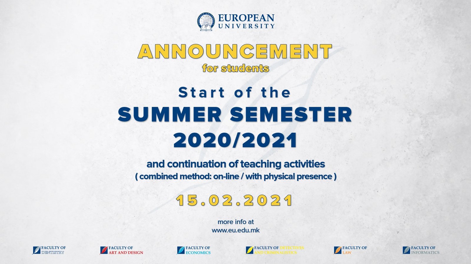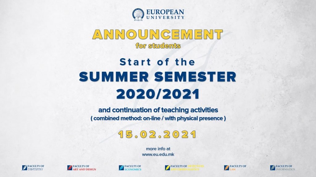 Dear students, We would like to inform you that the summer semester of the academic year 2020/2021 starts on 15.02.2021 and the teaching continues in combined […]