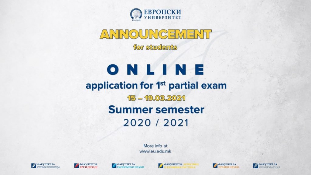 Dear students, Please be informed that exam registration for the upcoming First Partial Session 2020/2021 will be done online starting from March 15th to March 19th […]
