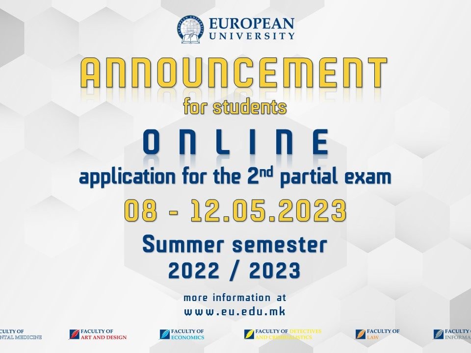 Dear students, Please be informed that the registration for the upcoming Second Partial Exam Session 2022/2023 (summer semester) will be done online starting from Маy 8th to Мay 12th 2023. As per […]