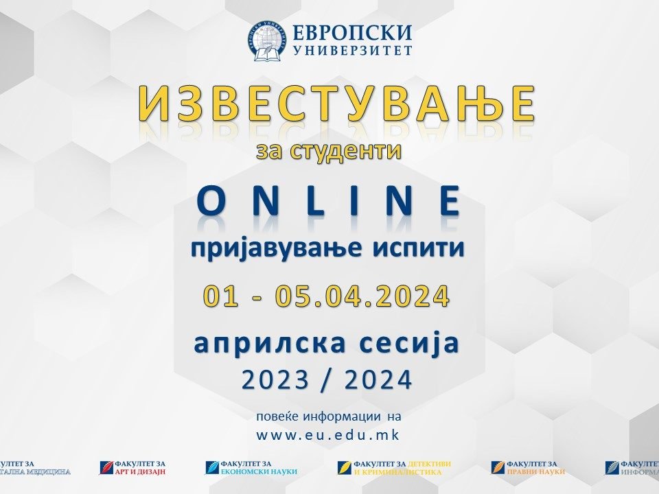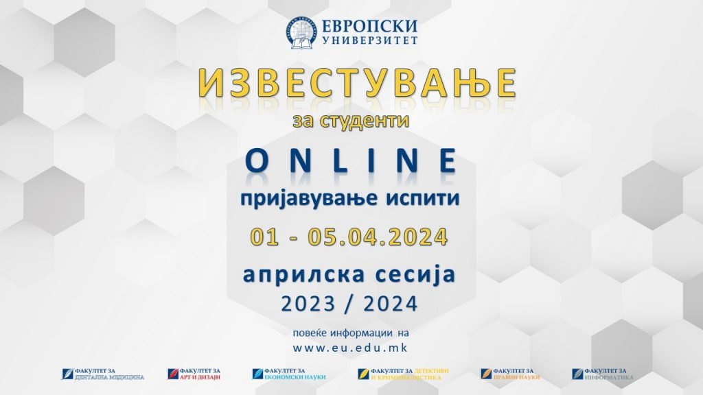 Почитувани студенти, Пријавувањето на испитите од априлскиот испитен рок ќе се врши on-line во периодот од 01.04 до 05.04.2024 година. Согласно глобалниот календар на активности, полагањето […]